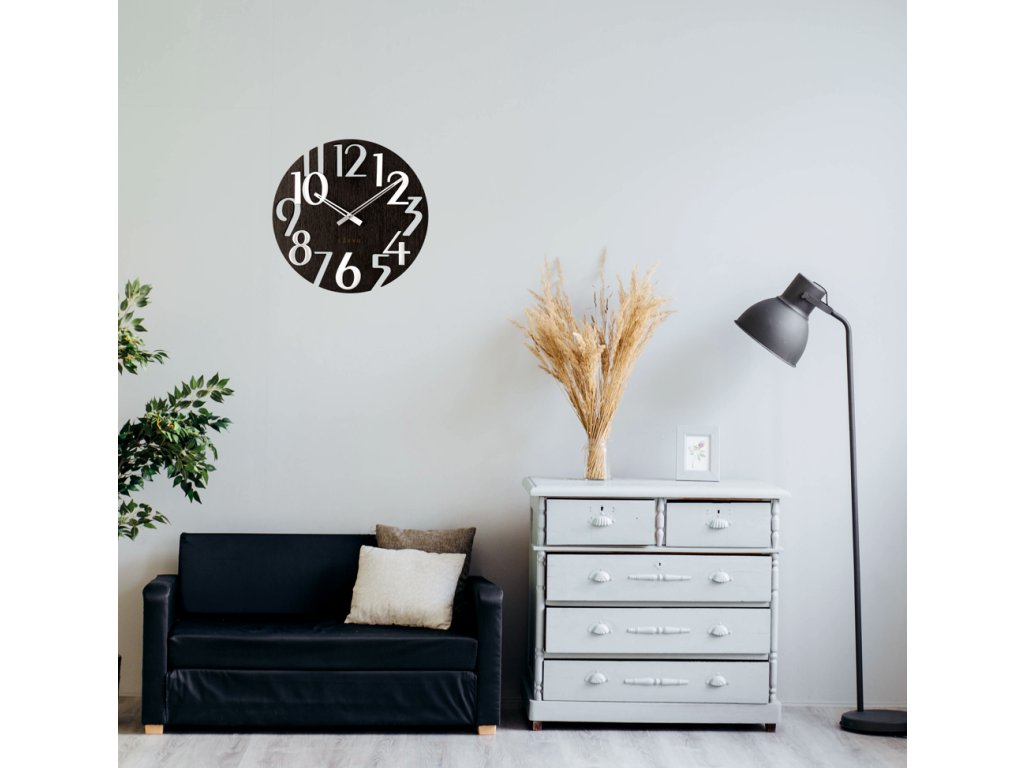 Tyto moderní vyřezávané hodiny jsou vyrobeny z černé dřevěné dýhy a dodají eleganci každé místnosti ve vaší domácnosti nebo kanceláři.