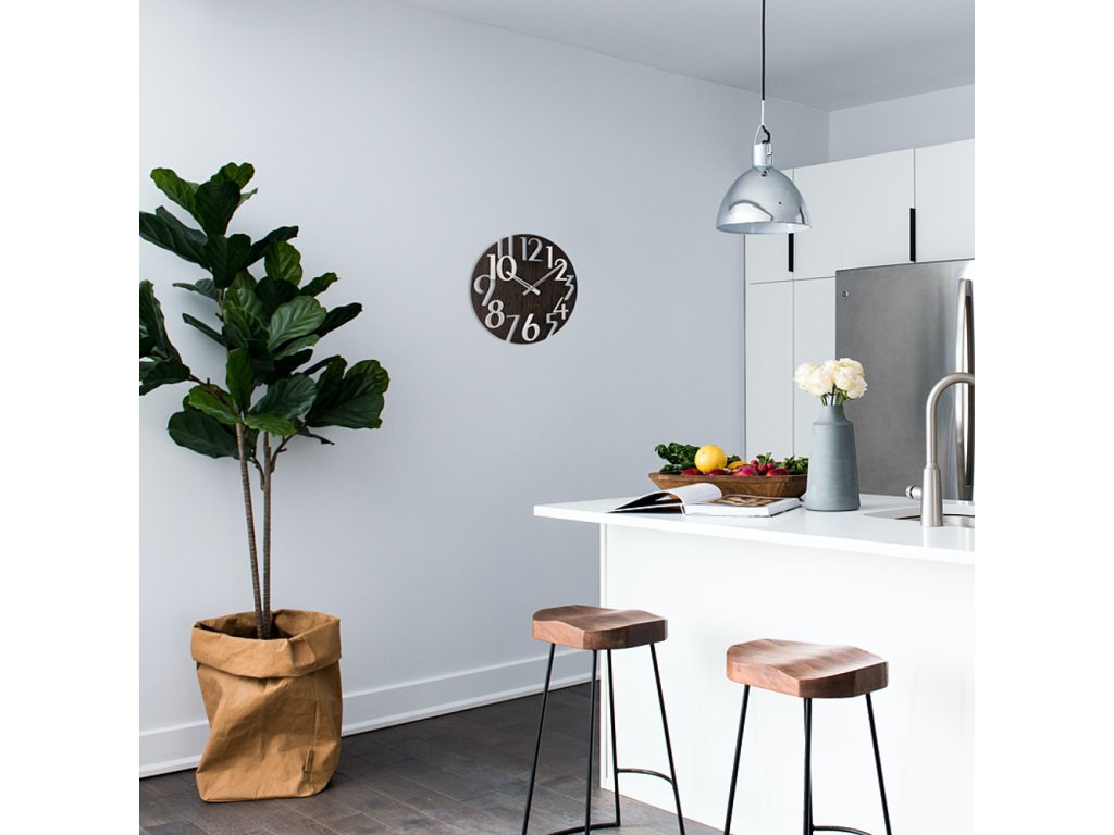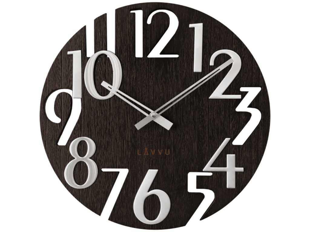 Ciferník zdobí stříbrné kovové číslice, logo LAVVU je na hodinách vypáleno laserem a díky průměru 40 cm jsou nejen praktickým pomocníkem, ale také stylovým doplňkem interiéru.